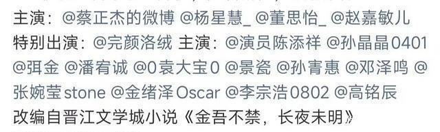 官宣个主演还有分两次,蔡正杰、杨星慧、董思怡、赵嘉敏名字后加了个“特别出演”完颜洛绒,又加了不少主演这波操作也是没谁了,看了一下名单,特别出演前的四位主演咖位要高于后边多位,就问一下这严谨度你服不服?哎…还是以前的剧作好,就一个主演、出演,一眼就能分出谁是男女主,而不像现在男女主还得分个第一、第二,也不知道是谁发明的!